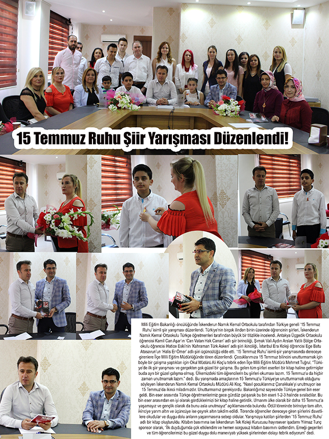 Milli Eğitim Bakanlığı öncülüğünde İskenderun Namık Kemal Ortaokulu tarafından Türkiye geneli ‘15 Temmuz Ruhu’ isimli şiir yarışması düzenlendi. Türkiye’nin birçok ilinden binin üzerinde öğrencinin şiirleri, İskenderun Namık Kemal Ortaokulu Türkçe öğretmenleri tarafından büyük bir titizlikle incelendi. Antakya Üçgedik Ortaokulu öğrencisi Kamil Can Aşar’ın ‘Can Vatan Hak Canan’ adlı şiir birinciliği, Şırnak Vali Aydın Arslan Yatılı Bölge Ortaokulu öğrencisi Hatice Eski’nin ‘Kahraman Türk Askeri’ adlı şiiri ikinciliği, İstanbul Era Koleji öğrencisi Ege Batu Atasavun’un ‘Halis Er Ömer’ adlı şiiri üçüncülüğü elde etti. ‘15 Temmuz Ruhu’ isimli şiir yarışmasında dereceye girenlere İlçe Milli Eğitim Müdürlüğünde tören düzenlendi. Çocuklarımıza 15 Temmuz bilincini unutturmamak için böyle bir çalışma yaptıkları için Okul Müdürü Ali Koç’u tebrik eden İlçe Milli Eğitim Müdürü Mehmet Tuğrul, “Türkiye’de ilk şiir yarışması ve gerçekten çok güzel bir çalışma. Bu gelen tüm şiirleri eserleri bir kitap haline getirmişler buda ayrı bir güzel çalışma olmuş. Ülkemizdeki tüm öğrencilerin bu şiirleri okuması lazım. 15 Temmuz’u da hiçbir zaman unutmamak lazım.” dedi. Bu yarışmada amaçlarının 15 Temmuz’u Türkiye’ye unutturmamak olduğunu söyleyen İskenderun Namık Kemal Ortaokulu Müdürü Ali Koç, “Nasıl çocuklarımız Çanakkale’yi unutmuyor ise 15 Temmuz’da ikinci miladımızdır. Unutturmamız gerekiyordu. Bakanlığımız sayesinde Türkiye genel bin eser geldi. Bin eser arasında Türkçe öğretmenlerimiz gece gündüz çalışarak bu bin eseri 1-2-3 halinde sıraladılar. Bu bin eser arasından en iyi olarak gördüklerimizi bir kitap haline getirdik. Umarım ülke olarak bir daha 15 Temmuz’a yaşamayız ve gençlik olarak da bunu asla unutmayız” açıklamasında bulundu. Ödül töreninde birinciye tam altın, ikinciye yarım altın ve üçüncüye ise çeyrek altın takdim edildi. Törende öğrenciler dereceye giren şiirlerini davetlilere okudular ve duygu dolu anların yaşanmasına sebep oldular. Yarışmaya katılan şiirlerden ’15 Temmuz Ruhu’ adlı bir kitap oluşturuldu. Kitabın basımına ise İskenderun Tek Koleji Kurucusu hayırsever işadamı Yılmaz Tunç sponsor olarak, “İlk duyduğumda çok etkilendim ve hemen sorgusuz kitabın basımını üstlendim. Emeği geçenleri ve tüm öğrencilerimizi bu güzel duygu dolu maneviyatı yüksek şiirlerinden dolayı tebrik ediyorum” dedi.