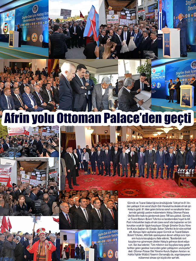 Gümrük ve Ticaret Bakanlığı’nın öncülüğünde Türkiye’nin 81 ilinden yaklaşık 5 bin esnaf Zeytin Dalı Harekatı’na destek olmak için Hatay’a geldi. 81 ilden gelen binlerce esnaf ve sanatkarlar beraberinde getirdiği yardım malzemelerini Hatay Ottoman Palace Otel’de Afrin halkına göndermek üzere TIR’lara yükledi. Gümrük ve Ticaret Bakanı Bülent Tüfenkci ve beraberindeki heyet ile AK Parti milletvekilleri başta olmak üzere esnaf oda başkanları ve tüm konukları sıcak bir ilgiyle karşılayan Güngör Şirketler Grubu Yönetim Kurulu Başkanı Ali Güngör, Bakan Tüfenkci ile bir süre sohbet etti. Konuya ilişkin açıklama yapan Gümrük ve Ticaret Bakanı Bülent Tüfenkci, Afrin’deki operasyonun devam ettikçe sınır ilçelerin huzura kavuştuğunu ifade ederek, “Buralardaki sivil kayıplarımızı göremeyen ülkeleri Hatay’a gelmeye davet ediyorum. Bizi ikaz edenler, Türk milletinin sivil kayıplara karşı gerek tarihten gelen gerekse inancından gelen yaklaşımını unutuyorlar” dedi. Ottoman Palace Otel Yönetim Kurulu Başkanı Asistanı ve Halkla İlişkiler Müdürü Yasemin Osmanoğlu da, organizasyonun mükemmel olması için büyük efor sarf etti.