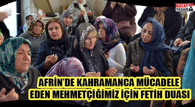 Antakya Belediye Başkanı İsmail Kimyeci’nin eşi Nursel Kimyeci öncülüğünde, mübarek Cuma günü ikindi namazına müteakip bir araya gelen hanımlar, Afrin’de kahramanca mücadele eden Mehmetçiğimiz için Fetih duası okudular. Antakya tarihi Ulu Cami’de düzenlenen Fetih Duası tilavetine, Antakya Kaymakamı Eflatun Can Tortop’un eşi Reyhan Tortop, Antakya Belediye Başkanı İsmail Kimyeci’nin eşi Nursel Kimyeci, İl Emniyet Müdürü Kamil Karabörk’ün eşi Zehra Karabörk, AK Parti İl Kadın Kolları Başkanı Sabahat Özgürsoy Çelik, AK Parti Antakya İlçe Kadın Kolları Başkanı Durdunaz Horoz, Belediye Meclis Üyesi Aynur Karaçete, şehit anneleri ve çok sayıda hanım katıldı. Fetih duasının ardından hanımlara Kur’an-ı Kerim ve tespih hediye edildi, çeşitli ikramlarda bulunuldu.