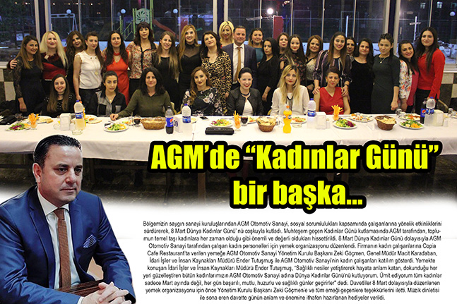 Bölgemizin saygın sanayi kuruluşlarından AGM Otomotiv Sanayi, sosyal sorumlulukları kapsamında çalışanlarına yönelik etkinliklerini sürdürerek, 8 Mart Dünya Kadınlar Günü’ nü coşkuyla kutladı. Muhteşem geçen Kadınlar Günü kutlamasında AGM tarafından, toplumun temel taşı kadınlara her zaman olduğu gibi önemli ve değerli oldukları hissettirildi. 8 Mart Dünya Kadınlar Günü dolayısıyla AGM Otomotiv Sanayi tarafından çalışan kadın personelleri için yemek organizasyonu düzenlendi. Firmanın kadın çalışanlarına Copia Cafe Restaurant’ta verilen yemeğe AGM Otomotiv Sanayi Yönetim Kurulu Başkanı Zeki Göçmen, Genel Müdür Macit Karadaban, İdari İşler ve İnsan Kaynakları Müdürü Ender Tutuşmuş ile AGM Otomotiv Sanayi’nin kadın çalışanları katılım gösterdi. Yemekte konuşan İdari İşler ve İnsan Kaynakları Müdürü Ender Tutuşmuş, “Sağlıklı nesiler yetiştirerek hayata anlam katan, dokunduğu her yeri güzelleştiren bütün kadınlarımızın AGM Otomotiv Sanayi adına Dünya Kadınlar Günü’nü kutluyorum. Ümit ediyorum tüm kadınlar sadece Mart ayında değil, her gün başarılı, mutlu, huzurlu ve sağlıklı günler geçirirler” dedi. Davetliler 8 Mart dolayısıyla düzenlenen yemek organizasyonu için önce Yönetim Kurulu Başkanı Zeki Göçmen’e ve tüm emeği geçenlere teşekkürlerini iletti. Müzik dinletisi ile sona eren davette günün anlam ve önemine ithafen hazırlanan hediyeler verildi.