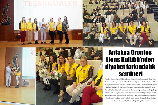 Antakya Orontes Lions Kulübü, Dünya Diyabet Günü kapsamında Hatay Doğa Okulları’nda lise öğrencilerine Doç.Dr. Kemal Ağbaht tarafından diyabet hakkında bilgi semineri verdi. Antakya Orontes Lions Kulübü Dönem Başkanı Çiğdem Zelluh,”Diyabet çok yaygınlaşan her yaşta görülen sinsi bir rahatsızlık bizde Dünya Diyabet Günü’nde aralarında diyabet hastası öğrencilerin de olduğu Doğa Okulları’nda bu bilgilendirme seminerini vererek farkındalık yaratmaya çalıştık. Katılım ve ilginin yoğunluğu bizi mutlu etti. Okul yönetimine ve Doç.Dr.Kemal Ağbaht’a çok teşekkür ederiz” dedi. Seminer sonrası Dönem Başkanı Çiğdem Zelluh tarafından, Doç.Dr.Kemal Ağbaht’a plaket verildi.