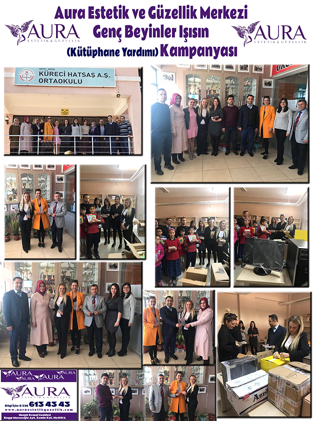 Aura Estetik ve Güzellik Merkezi olarak işimizde en iyisini hedeflerken içinde yaşadığımız toplumun ihtiyaçlarına faydalı çözümler üretmek amacıyla da sosyal sorumluluk bilinciyle hareket etmekteyiz. Bu bilinçle başlattığımız, çözüm ortaklarımız ve bağışçılarımız sayesinde ulusal boyuta taşıdığımız “Minik Ayaklar Üşümesin” projemizin bünyesinde 2016 yılından itibaren Hatay İli içerisinde 40, Doğu Anadolu Bölgesi’nde de 20 tane olmak üzere toplamda 60 okulda 2000 çift ayakkabı hediye ederek ihtiyaç sahibi çocuklarımızı mutlu etme fırsatı yakaladık. Bu haftada Dünya çocuk kitap haftası, Bu projemizin yanına bir yenisi olan “Genç Beyinler Işısın” projesini ekleyerek Haziran ayında Hatay’ın Kumlu İlçesi’nde bulunan 15 Temmuz Şehitleri Ortaokulu’na 550 adet kitap ve 1 adet bilgisayar, Payas İlçesi’nde bulunan Mimar Sinan İlköğretim Okulu ve Atatürk Ortaokulu’na 700 adet kitap, 7 adet satranç takımı ve 1 adet bilgisayar yardımında bulunduk.