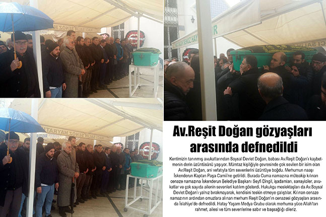 Kentimizin tanınmış avukatlarından Soysal Devlet Doğan, babası Av.Reşit Doğan’ı kaybetmenin derin üzüntüsünü yaşıyor. Mümtaz kişiliğiyle çevresinde çok sevilen bir isim olan Av.Reşit Doğan, ani vefatıyla tüm sevenlerini üzüntüye boğdu. Merhumun naaşı İskenderun Kaptan Paşa Camii’ne getirildi. Burada Cuma namazına müteakip kılınan cenaze namazına İskenderun Belediye Başkanı Seyfi Dingil, işadamları, sanayiciler, avukatlar ve çok sayıda ailenin sevenleri katılım gösterdi. Hukukçu meslektaşları da Av.Soysal Devlet Doğan’ı yalnız bırakmayarak, kendisini teskin etmeye çalıştılar. Kılınan cenaze namazının ardından omuzlara alınan merhum Reşit Doğan’ın cenazesi gözyaşları arasında İslahiye’de defnedildi. Hatay Yaşam Medya Grubu olarak merhuma yüce Allah’tan rahmet, ailesi ve tüm sevenlerine sabır ve başsağlığı dileriz.