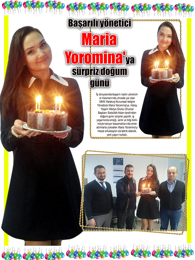 İş dünyasında başarılı kadın yöneticiler klasmanında zirvede yer alan MMK Metalurji Kurumsal iletişim Yöneticisi Maria Yoromina’ya, Hatay Yaşam Medya Grubu Onursal Başkanı Sadullah Aslan tarafından doğum günü sürprizi yapıldı. iş yaşamında emeği, azmi ve bilgi birikimiyle kariyer basamaklarında emin adımlarla yükselen Maria Yoramina’yı mesai arkadaşları da tebrik ederek, yeni yaşını kutladı.