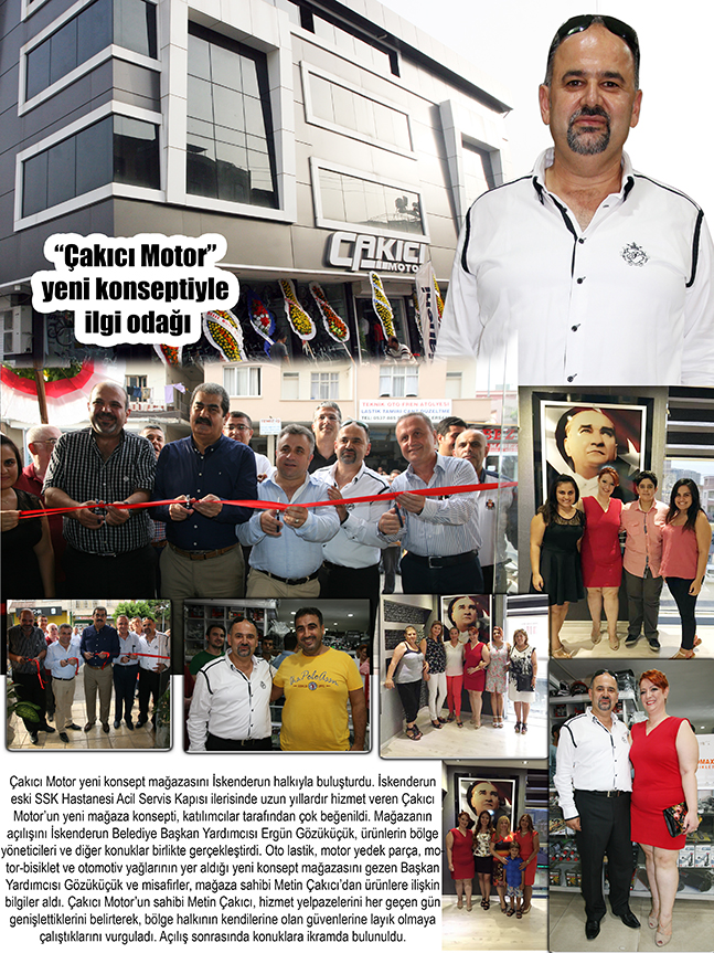 Çakıcı Motor yeni konsept mağazasını İskenderun halkıyla buluşturdu. İskenderun eski SSK Hastanesi Acil Servis Kapısı ilerisinde uzun yıllardır hizmet veren Çakıcı Motor’un yeni mağaza konsepti, katılımcılar tarafından çok beğenildi. Mağazanın açılışını İskenderun Belediye Başkan Yardımcısı Ergün Gözüküçük, ürünlerin bölge yöneticileri ve diğer konuklar birlikte gerçekleştirdi. Oto lastik, motor yedek parça, motor-bisiklet ve otomotiv yağlarının yer aldığı yeni konsept mağazasını gezen Başkan Yardımcısı Gözüküçük ve misafirler, mağaza sahibi Metin Çakıcı’dan ürünlere ilişkin bilgiler aldı. Çakıcı Motor’un sahibi Metin Çakıcı, hizmet yelpazelerini her geçen gün genişlettiklerini belirterek, bölge halkının kendilerine olan güvenlerine layık olmaya çalıştıklarını vurguladı. Açılış sonrasında konuklara ikramda bulunuldu.