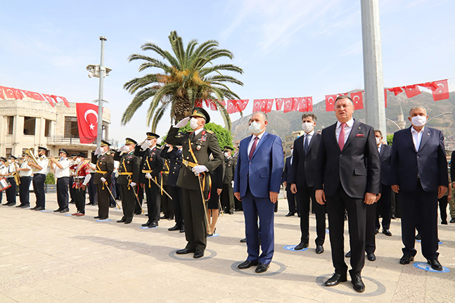 29 Ekim Cumhuriyet Bayramı kutlama etkinlikleri kapsamında Hatay Valiliği tarafından düzenlenen çelenk sunma törenine Başkan Savaş ile birlikte Hatay Vali Yardımcısı Aydın Tetikoğlu, Garnizon Komutanı Tuğgeneral Orhan Akkurt, protokol üyeleri, ilçe belediye başkanları, gaziler, kurum ve kuruluş müdürleri, STK temsilcileri, siyasi parti il başkanları ve çok sayıda vatandaş katıldı. Cumhuriyetimizin kurucusu Ulu Önder Mustafa Kemal Atatürk ve silah arkadaşlarının manevi huzurlarında saygı ile eğilen Başkan Savaş, şükranlarını sundu. Atatürk Anıtı’na çelenk sunulmasının ardından Gazi Mustafa Kemal Atatürk ve silah arkadaşlarının anısına saygı duruşunda bulunuldu. HBB Bandosu eşliğinde hep bir ağızdan okunan İstiklal Marşı’nın ardından Hatay Vali Yardımcısı Aydın Tetikoğlu duygu ve düşüncelerini paylaşarak şeref defterini imzaladı.