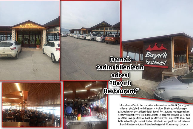 İskenderun Denizciler mevkiinde hizmet veren Yörük Çadırı, yenilenen yüzüyle Bayırlı Restaurant oldu. Bir süredir dekorasyon çalışmalarının gerçekleştirildiği Bayırlı Restaurant, muhteşem konsepti ve lezzetleriyle ilgi odağı. Hafta içi serpme kahvaltı ve kebap çeşitleri, tava çeşitleri ve balık çeşitlerinin yanı sıra; hafta sonu açık büfe kahvaltısıyla damak tadını bilenlerin vazgeçilmez adresi olan Bayırlı Restaurant, taraflı tarafsız beğenisini kazanmayı başardı.