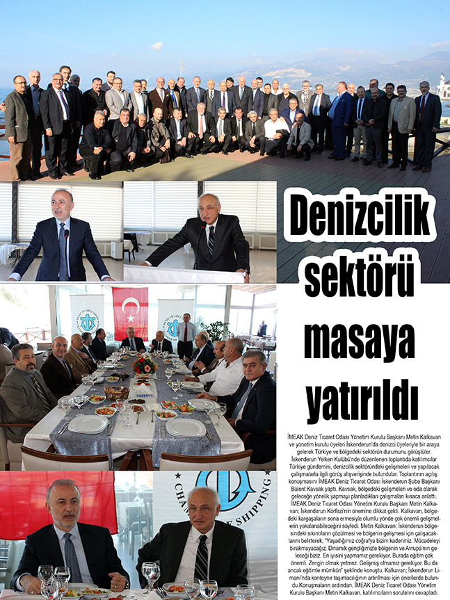 İMEAK Deniz Ticaret Odası Yönetim Kurulu Başkanı Metin Kalkavan ve yönetim kurulu üyeleri İskenderun’da denizci üyeleriyle bir araya gelerek Türkiye ve bölgedeki sektörün durumunu görüştüler. İskenderun Yelken Kulübü’nde düzenlenen toplantıda katılımcılar Türkiye gündemini, denizcilik sektöründeki gelişmeleri ve yapılacak çalışmalarla ilgili görüş alışverişinde bulundular. Toplantının açılış konuşmasını İMEAK Deniz Ticaret Odası İskenderun Şube Başkanı Bülent Kavsak yaptı. Kavsak, bölgedeki gelişmeleri ve oda olarak geleceğe yönelik yapmayı planladıkları çalışmaları kısaca anlattı. İMEAK Deniz Ticaret Odası Yönetim Kurulu Başkanı Metin Kalkavan; İskenderun Körfezi’nin önemine dikkat çekti. Kalkavan, bölgedeki kargaşaların sona ermesiyle olumlu yönde çok önemli gelişmelerin yakalanabileceğini söyledi. Metin Kalkavan; İskenderun bölgesindeki sıkıntıların çözülmesi ve bölgenin gelişmesi için çalışacaklarını belirterek; “Yaşadığımız coğrafya bizim kaderimiz. Mücadeleyi bırakmayacağız. Dinamik gençliğimizle bölgenin ve Avrupa’nın geleceği biziz. En iyisini yapmamız gerekiyor. Burada eğitim çok önemli. Zengin olmak yetmez. Gelişmiş olmamız gerekiyor. Bu da ancak eğitimle mümkün” şeklinde konuştu. Kalkavan; İskenderun Limanı’nda konteynır taşımacılığının artırılması için önerilerde bulundu.Konuşmaların ardından, İMEAK Deniz Ticaret Odası Yönetim Kurulu Başkanı Metin Kalkavan, katılımcıların sorularını cevapladı.
