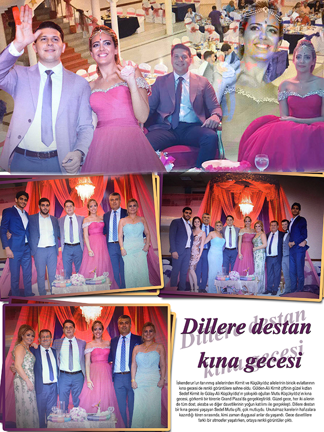 İskenderun’un tanınmış ailelerinden Kirmit ve Küçükyıldız ailelerinin biricik evlatlarının kına gecesi de renkli görüntülere sahne oldu. Gülden-Ali Kirmit çiftinin güzel kızları Sedef Kirmit ile Gülay-Ali Küçükyıldız’ın yakışıklı oğulları Mutlu Küçükyıldız’ın kına gecesi, görkemli bir törenle Grand Plaza’da gerçekleştirildi. Güzel gece, her iki ailenin de tüm dost, akraba ve diğer davetlilerinin yoğun katılımı ile gerçekleşti. Dillere destan bir kına gecesi yaşayan Sedef-Mutlu çifti, çok mutluydu. Unutulmaz karelerin hafızalara kazındığı tören sırasında, kimi zaman duygusal anlar da yaşandı. Gece davetlilere farklı bir atmosfer yaşatırken, ortaya renkli görüntüler çıktı.