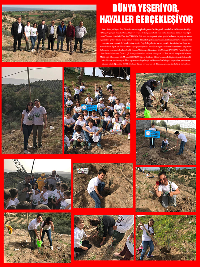 Arsuz Pirinçlik Büyükdere İlkokulu, etwinning plus kapsamında ülke geneli 190 okul ve 7 ülkeninde katıldığı “Dünya Yeşeriyor, Hayaller Gerçekleşiyor” projesi ile barışın sembolü olan zeytin fidanlarını diktiler. Sınıf öğretmeni Yasemin HAMARAT ve Aslı YILDIRIM ORHAN öncülüğünde şubat ayında başlatılan bu projenin amacı öğrencilere çevre bilincini kazandırmak ve sanal dünyada boğulan çocukların hayal kurmalarını ve bu hayallerini gerçekleştirme yolunda ilerlemelerini sağlamak. Projede hayaller iki kağıda yazıldı . Kağıtlardan biri hayal kutusunda kaldı diğeri ise fidanla birlikte toprağa yerleştirildi. Pirinçlik Yangın Söndürme İlk Müdahale Ekip Binası bahçesinde gerçekleştirilen bu etkinlik Orman Müdürlüğü İskenderun Şefi Mehmet BAŞARAN, Pirinçlik Büyükdere İlkokulu Müdürü Ümit ELÇİ, Pirinçlik Mahallesi Muhtarı Hüseyin CİRDİ ve bir çok veli yer aldı. Orman Müdürlüğü İskenderun Şefi Mehmet BAŞARAN öğrencileri fidan dikimi konusunda bilgilendirerek ilk fidanı birlikte diktiler. 51 adet zeytin fidanı öğrencilerin hayalleriyle birlikte toprakta buluştu. Heyecanları yüzlerinden okunan minik öğrenciler diktikleri fidanın ilk can suyunu vererek dünyanın yeşermesine katkıda bulundular.