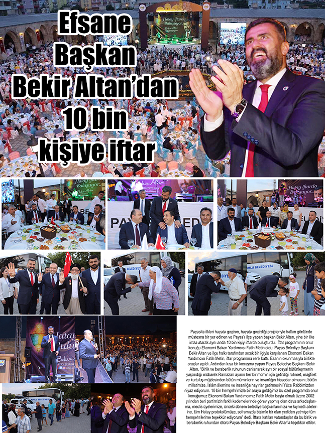 Payas’ta ilkleri hayata geçiren, hayata geçirdiği projeleriyle halkın gönlünde müstesna bir yer edinen ve Payas’ı ilçe yapan başkan Bekir Altan, yine bir ilke imza atarak aynı anda 10 bin kişiyi iftarda buluşturdu. İftar programının onur konuğu Ekonomi Bakan Yardımcısı Fatih Metin oldu. Payas Belediye Başkanı Bekir Altan ve ilçe halkı tarafından sıcak bir ilgiyle karşılanan Ekonomi Bakan Yardımcısı Fatih Metin, iftar programına renk kattı. Ezanın okunmasıyla birlikte oruçlar açıldı. Ardından kısa bir konuşma yapan Payas Belediye Başkanı Bekir Altan, “Birlik ve beraberlik ruhunun canlanarak ayrı bir sosyal bütünleşmenin yaşandığı mübarek Ramazan ayının her bir mümin için getirdiği rahmet, mağfiret ve kurtuluş müjdesinden bütün müminlerin ve insanlığın hissedar olmasını; bütün milletimize, İslâm âlemine ve insanlığa hayırlar getirmesini Yüce Rabbimizden niyaz ediyorum. 10 bin hemşehrimizle bir araya geldiğimiz bu özel programda onur konuğumuz Ekonomi Bakan Yardımcımız Fatih Metin başta olmak üzere 2002 yılından beri partimizin farklı kademelerinde görev yapmış olan dava arkadaşlarıma, meclis üyelerimize, önceki dönem belediye başkanlarımıza ve kıymetli ailelerine, tüm Hatay protokolümüze, soframızda bizimle bir olan yediden yetmişe tüm hemşehrilerime teşekkür ediyorum” dedi. İftara katılan vatandaşlar da bu birlik ve beraberlik ruhundan ötürü Payas Belediye Başkanı Bekir Altan’a teşekkür ettiler.