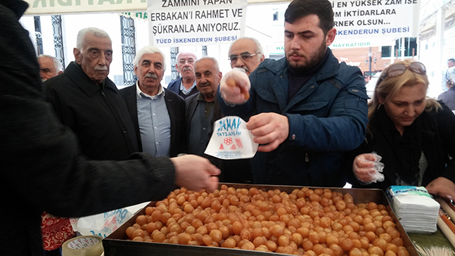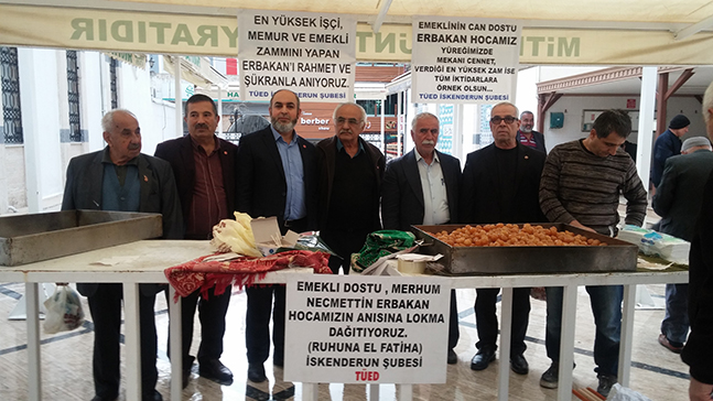 Siyaset ve devlet adamı Prof. Dr. Necmettin Erbakan’ın 7. Ölüm yıldönümü dolayısıyla, merhum Erbakan’ın ruhuna, Saadet Partisi (SP) İskenderun İlçe Teşkilatınca İskenderun Kaptan Paşa Cami’nde mevlit okutulurken, Türkiye Emekliler Derneği (TÜED) İskenderun Şubesi yönetimi de, mevlit sonrası cami avlusunda merhum Erbakan hoca ruhuna lokma dağıttı. Mevlide ve düzenlenen etkinliğe TBMM İdare Amiri Hatay Milletvekili Orhan Karasayar, İskenderun Belediye Başkanı Seyfi Dingil, TÜED İskenderun Şube Başkanı Mustafa Uyan, TÜED İskenderun şube yönetim kurulu üyeleri, Saadet Partisi İskenderun İlçe Başkanı Halil İbrahim Çelik, SP ilçe yönetim kurulu üyeleri, partililer, Mar-Der İskenderun Şube Başkanı Salih Bayar, ve çok sayıda emekli ve bazı vatandaşlar katıldılar. Lokma dağıtımı sırasında konuşan Türkiye Emekliler Derneği (TÜED) İskenderun Şube Başkanı Mustafa Uyan “Siyaset ve devlet adamı merhum Erbakan, Cumhuriyet tarihinin en büyük zammını işçi, emekli ve memura yapmıştır. Erbakan hocanın emekliye, işçiye, dul ve yetime, dar gelirliye, memura sahip çıkan anlayışını unutmamız mümkün değildir. Necmettin Erbakan hocamızın emekli ve işçiye verdiği en yüksek zam, bugünkü iktidara ve bundan sonra gelecek olası iktidarlara örnek olmalıdır. Biz Prof. Dr. Necmettin Erbakan hocamızı her yıl, ölüm yıldönümümde ruhuna okutulan mevlit sonrası lokma dağıtarak onu, şükran ve rahmetle anıyoruz. Mekânı cennet olsun. Siyaset ve devlet adamları, bakanlar, Başbakanlar ve Cumhurbaşkanları, Erbakan hocamız gibi emekli, işçi ve dar gelirlilerin can dostu olmalıdır. Sayın Necmettin Erbakan’ın vaktiyle yaptığı emekli, işçi, dul ve yetim maaşları da önümüzdeki aylarda güncellenmeli ve emeklinin yüzü güldürülmelidir. Emekli 2018 yılının ikinci yarısını ve 2019’u rahat geçirmelidir. Bundan sonraki yıllarda yapılacak enflasyon zam sistemi de değiştirilerek, işçi ve emekliye çay kaşığıyla zam vermekten vazgeçilmelidir. Eskiden kepçeyle yapılan genel piyasa zamlarına karşılık olarak çorba kaşığıyla maaş zammı verilirdi. Şimdi kepçeyle yapılan zamma, çay kaşığıyla maaş zammı verilir oldu. Bu böyle gitmez ve gitmemeli. Yetersiz maaşlar başta olmak üzere tüm sorunlarımız için daha önce ifade ettiğim üzere yeni bir bakanlık kurulmalı ve adı ‘Emekli Bakanlığı’ olmalıdır. Ülkemizde 12 milyona yakın emekli varken, emekliye, sadece emeklilerin sorunlarıyla ilgilenecek olan ‘Emekli Bakanlığı’ çok görülmemelidir. Son olarak bir kere daha emekli ve işçi dostu Erbakan hocamızı minnet, saygı ve rahmetle andığımızı ifade etmek istiyorum” diye konuştu.