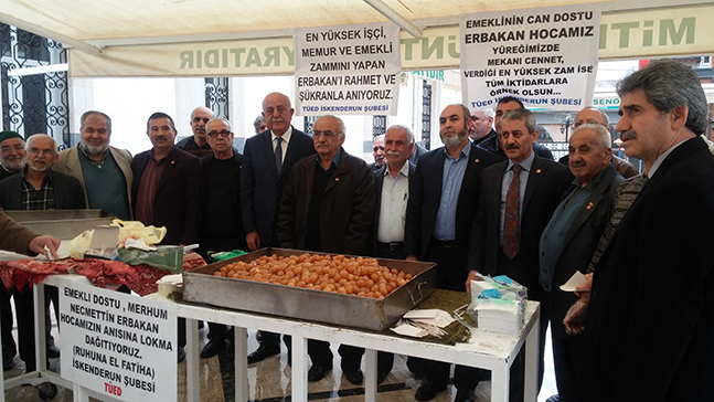 SP İlçe Başkanı Hallil İbrahim Çelik ise lokma dağıtımı sonrası “Bizler SP İskenderun İlçe Teşkilatı olarak hocamız, liderimiz ilim, fikir, devlet ve dava adamı Prof Dr. Necmettin Erbakan’ı anarken yanımızda, bölge milletvekillerimizi, belediye başkanlarımızı, emeklilerimizi, sivil toplum örgütlerimizi ve vatandaşlarımızı görmek bizleri onurlandırıp, mutlu ediyor. Son yıllarda emeklilerimiz özellikle TÜED İskenderun Şubesi, merhum Erbakan’ı şükranla anmayı ve lokma dağıtmayı sürekli hale getirdiler. İçlerinden gelen şükran duygularını burada samimiyetle ifade etmeleri bizler için önemli duygulardır. Allah hepsinden razı olsun. Türkiye Emekliler Derneği İskenderun Şube Başkanı Mustafa Uyan ile sayın yönetim kurulu üyelerine ve tüm emeklilerimize, bu anlamlı lokma dağıtımı için teşekkür ediyoruz. Erbakan hocamızda, devlet ve dava adamı Erbakan hocamızda bir kere daha Allah’tan rahmet diliyoruz. Mekânı cennet olur inşallah” şeklinde konuştu.