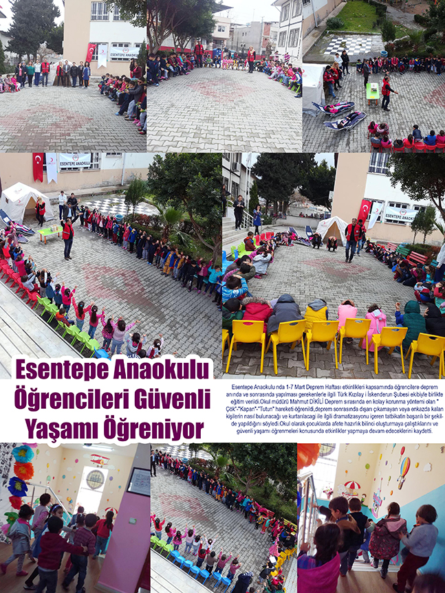 Esentepe Anaokulu nda 1-7 Mart Deprem Haftası etkinlikleri kapsamında öğrencilere deprem anında ve sonrasında yapılması gerekenlerle ilgili Türk Kızılay i İskenderun Şubesi ekibiyle birlikte eğitim verildi.Okul müdürü Mahmut DİKİLİ Deprem sırasında en kolay korunma yöntemi olan ” Çök”-“Kapan”-“Tutun” hareketi öğrenildi,deprem sonrasında dışarı çıkamayan veya enkazda kalan kişilerin nasıl bulunacağı ve kurtarılacagi ile ilgili dramatizasyonu içeren tatbikatin başarılı bir şekilde yapıldığını söyledi.Okul olarak çocuklarda afete hazırlık bilinci oluşturmaya çalıştıklarını ve güvenli yaşamı öğrenmeleri konusunda etkinlikler yapmaya devam edeceklerini kaydetti.
