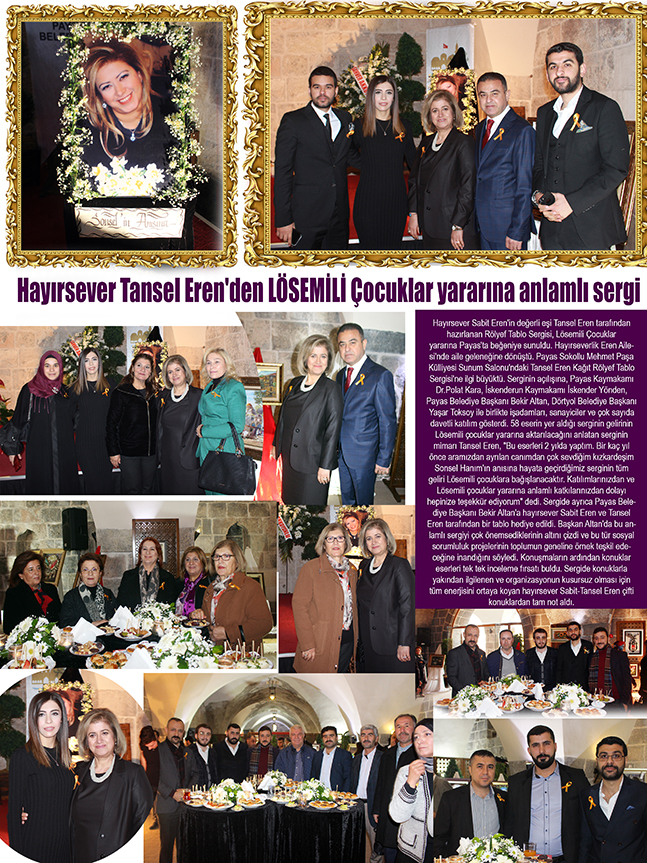 Hayırsever Sabit Eren’in değerli eşi Tansel Eren tarafından hazırlanan Rölyef Tablo Sergisi, Lösemili Çocuklar yararına Payas’ta beğeniye sunuldu. Hayırseverlik Eren Ailesi’nde aile geleneğine dönüştü. Payas Sokollu Mehmet Paşa Külliyesi Sunum Salonu’ndaki Tansel Eren Kağıt Rölyef Tablo Sergisi’ne ilgi büyüktü. Serginin açılışına, Payas Kaymakamı Dr.Polat Kara, İskenderun Kaymakamı İskender Yönden, Payas Belediye Başkanı Bekir Altan, Dörtyol Belediye Başkanı Yaşar Toksoy ile birlikte işadamları, sanayiciler ve çok sayıda davetli katılım gösterdi. 58 eserin yer aldığı serginin gelirinin LÖSEV’e aktarılacağını anlatan serginin mimarı Tansel Eren, “Bu eserleri 2 yılda yaptım. Bir kaç yıl önce aramızdan ayrılan canımdan çok sevdiğim kızkardeşim Sonsel Hanım’ın anısına hayata geçirdiğimiz serginin tüm geliri Lösemili çocuklara yararına bağışlanacaktır.