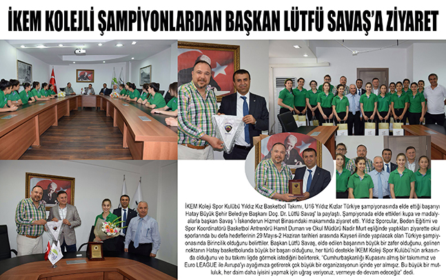 İKEM Koleji Spor Kulübü Yıldız Kız Basketbol Takımı, U16 Yıldız Kızlar Türkiye şampiyonasında elde ettiği başarıyı Hatay Büyük Şehir Belediye Başkanı Doç. Dr. Lütfü Savaş’ la paylaştı. Şampiyonada elde ettikleri kupa ve madalyalarla başkan Savaş ‘ı İskenderun Hizmet Binasındaki makamında ziyaret etti. Yıldız Sporcular, Beden Eğitimi ve Spor Koordinatörü Basketbol Antrenörü Hamit Duman ve Okul Müdürü Nadir Murt eşliğinde yaptıkları ziyarette okul sporlarında bu defa hedeflerinin 29 Mayıs-2 Haziran tarihleri arasında Kayseri ilinde yapılacak olan Türkiye şampiyonasında Birincilik olduğunu belirttiler. Başkan Lütfü Savaş, elde edilen başarının büyük bir zafer olduğunu, gelinen noktanın Hatay basketbolunda büyük bir başarı olduğunu, her türlü destekle İKEM Koleji Spor Kulübü’nün arkasında olduğunu ve bu takımı ligde görmek istediğini belirterek, “Cumhurbaşkanlığı Kupasını almış bir takımımız ve Euro LEAGUE ile Avrupa’yı ayağımıza getirerek çok büyük bir organizasyonun içinde yer almışız. Bu büyük bir mutluluk, her daim daha iyisini yapmak için uğraş veriyoruz, vermeye de devam edeceğiz” dedi.