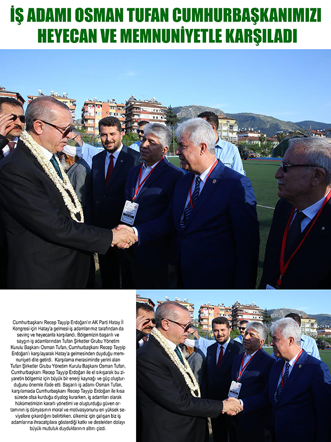 Cumhurbaşkanı Recep Tayyip Erdoğan’ın AK Parti Hatay İl Kongresi için Hatay’a gelmesi iş adamlarımız tarafından da sevinç ve heyecanla karşılandı. Bölgemizin başarılı ve saygın iş adamlarından Tufan Şirketler Grubu Yönetim Kurulu Başkanı Osman Tufan, Cumhurbaşkanı Recep Tayyip Erdoğan’ı karşılayarak Hatay’a gelmesinden duyduğu memnuniyeti dile getirdi.