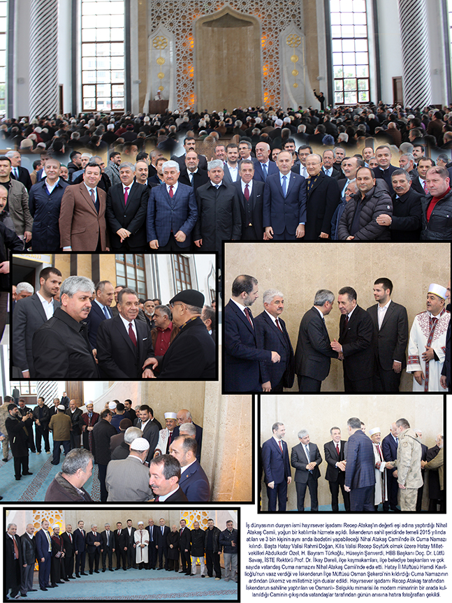 İş dünyasının duayen ismi hayırsever işadamı Recep Atakaş’ın değerli eşi adına yaptırdığı Nihal Atakaş Camii, yoğun bir katılımla hizmete açıldı. İskenderun sahil şeridinde temeli 2015 yılında atılan ve 3 bin kişinin aynı anda ibadetini yapabileceği Nihal Atakaş Camii’nde ilk Cuma Namazı kılındı. Başta Hatay Valisi Rahmi Doğan, Kilis Valisi Recep Soytürk olmak üzere Hatay Milletvekilleri Abdulkadir Özel, H. Bayram Türkoğlu, Hüseyin Şanverdi, HBB Başkanı Doç. Dr. Lütfü Savaş, İSTE Rektörü Prof. Dr. İlkay Dereli, ilçe kaymakamları, ilçe belediye başkanları ve çok sayıda vatandaş Cuma namazını Nihal Atakaş Camii’nde eda etti. Hatay İl Müftüsü Hamdi Kavillioğlu’nun vaaz verdiği ve İskenderun İlçe Müftüsü Osman Şekerci’nin kıldırdığı Cuma Namazının ardından ülkemiz ve milletimiz için dualar edildi. Hayırsever işadamı Recep Atakaş tarafından İskenderun sahiline yaptırılan ve Osmanlı- Selçuklu mimarisi ile modern mimarinin bir arada kullanıldığı Caminin çıkışında vatandaşlar tarafından günün anısına hatıra fotoğrafları çekildi.