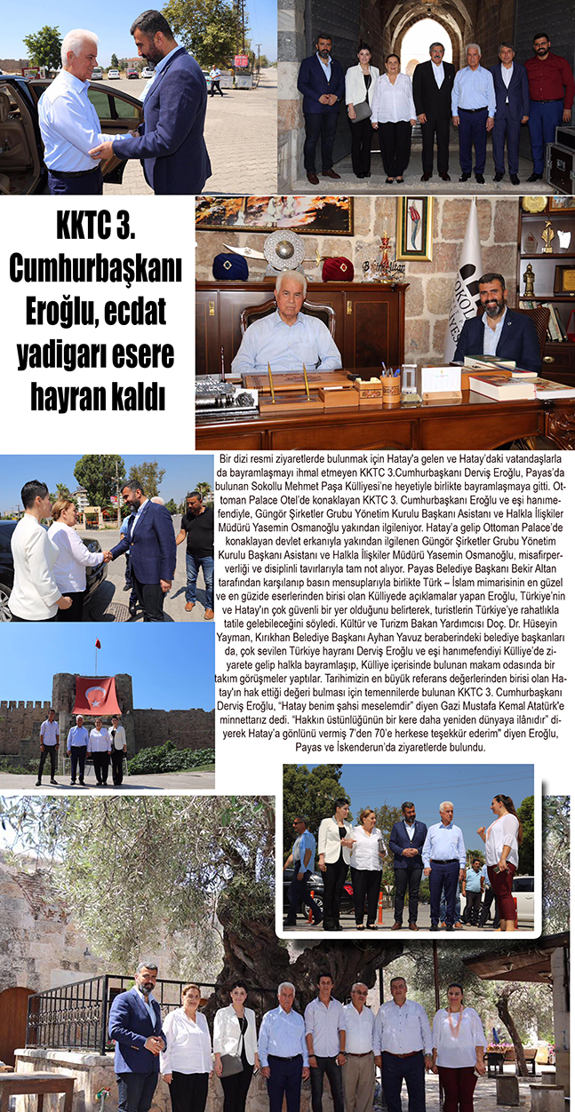 Bir dizi resmi ziyaretlerde bulunmak için Hatay’a gelen ve Hatay’daki vatandaşlarla da bayramlaşmayı ihmal etmeyen KKTC 3.Cumhurbaşkanı Derviş Eroğlu, Payas’da bulunan Sokollu Mehmet Paşa Külliyesi’ne heyetiyle birlikte bayramlaşmaya gitti. Ottoman Palace Otel’de konaklayan KKTC 3. Cumhurbaşkanı Eroğlu ve eşi hanımefendiyle, Güngör Şirketler Grubu Yönetim Kurulu Başkanı Asistanı ve Halkla İlişkiler Müdürü Yasemin Osmanoğlu yakından ilgileniyor. Hatay’a gelip Ottoman Palace’de konaklayan devlet erkanıyla yakından ilgilenen Güngör Şirketler Grubu Yönetim Kurulu Başkanı Asistanı ve Halkla İlişkiler Müdürü Yasemin Osmanoğlu, misafirperverliği ve disiplinli tavırlarıyla tam not alıyor. Payas Belediye Başkanı Bekir Altan tarafından karşılanıp basın mensuplarıyla birlikte Türk – İslam mimarisinin en güzel ve en güzide eserlerinden birisi olan Külliyede açıklamalar yapan Eroğlu, Türkiye’nin ve Hatay’ın çok güvenli bir yer olduğunu belirterek, turistlerin Türkiye’ye rahatlıkla tatile gelebileceğini söyledi. Kültür ve Turizm Bakan Yardımcısı Doç. Dr. Hüseyin Yayman, Kırıkhan Belediye Başkanı Ayhan Yavuz beraberindeki belediye başkanları da, çok sevilen Türkiye hayranı Derviş Eroğlu ve eşi hanımefendiyi Külliye’de ziyarete gelip halkla bayramlaşıp, Külliye içerisinde bulunan makam odasında bir takım görüşmeler yaptılar. Tarihimizin en büyük referans değerlerinden birisi olan Hatay’ın hak ettiği değeri bulması için temennilerde bulunan KKTC 3. Cumhurbaşkanı Derviş Eroğlu, “Hatay benim şahsi meselemdir” diyen Gazi Mustafa Kemal Atatürk’e minnettarız dedi. “Hakkın üstünlüğünün bir kere daha yeniden dünyaya ilânıdır” diyerek Hatay’a gönlünü vermiş 7’den 70’e herkese teşekkür ederim” diyen Eroğlu, Payas ve İskenderun’da ziyaretlerde bulundu.