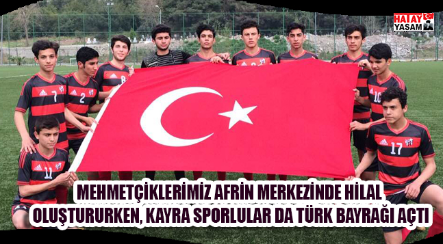 Mehmetçiğimiz sabah saatlerinde Afrin’i terörden arındırıp kent merkezinde Hilal oluştururken, İskenderun Kayra Spor’un genç futbolcuları da Türk bayrağı açması taraftarlardan uzun süre ayakta alkış aldı. Suriye’nin Afrin bölgesini teröristlerden arındırmaya yönelik yürütülen Zeytin Dalı Harekatı kapsamında şehir merkezinin Türk Silahlı Kuvvetleri ve Özgür Suriye Ordusu tarafından kontrol altına alınmasının ardından Mehmetçik kent meydanında bir araya gelerek Hilal oluşturdu. Gelen bu sevinçli haberin ardından Hatay Amatör Küme (U-17) Gençler liginde lider durumda bulunan İskenderun Kayra Spor’un genç futbolcuları da sahanın ortasında dev Türk Bayrağı açması taraftarlardan uzun süre alkış aldı. İskenderun Kayra Spor, Sarıseki Fuat Tosyalı tesislerinde yapılan karşılaşmada Payas Spor’u 4-0 mağlup ederek grupta 16 puan ile liderliğini sürdürüyor.