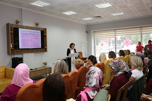 Meme kanserinin simgesi olan pembe rengin hakim olduğu salonda verdiği dikkat çekici ve yararlı bilgiler ile kadınların ilgi odağı haline gelen Savaş, konuşmasında; “ Yaşınız arttıkça meme kanserine yakalanma riskiniz artıyor. Adet, üreme ve aile öyküsü değiştiremeyeceğimiz risk faktörler arasında yer alıyor. Hiç doğum yapmamış ve hiç emzirmemiş olmak bu hastalığa yakalanma riskini arttırıyor. Aynı şekilde eğer birinci derece yakınınızda bu hastalığa rastlanmış ise diğer kadınlara oranla 3-4 kat daha fazla risk altında olabilirsiniz. Bu nedenle kontrollerinizi daha sık yaptırmalısınız ” ifadelerine yer verdi. Konuşmasının sonunda kadınların kendi kendilerine meme muayenelerini yapmalarının önemine dikkat çeken Savaş, KETEM (Kanser Erken Teşhis, Tarama ve Eğitim Merkezi) binalarında kanser taramalarının ücretsiz olarak yapıldığını vurguladı.