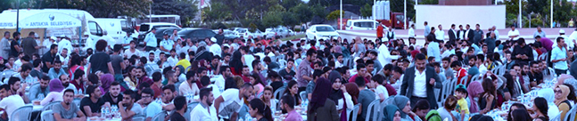 Ramazan ayı dolayısıyla her gün farklı bir yerde iftar yemeği veren Antakya Belediyesi, MKÜ öğrencileri için de Tayfur Sökmen Kampusu Amfi Tiyatro alanında 2 bin kişilik yemek organizasyonu düzenledi. Öğrencilerin yoğun katılım gösterdiği organizasyona MKÜ Rektörü Prof. Dr. Hasan Kaya, Antakya Belediye Başkanı İsmail Kimyeci, Rektör Yardımcıları Prof. Dr. Mehmet Kılınç, Prof. Dr. Yusuf Önlen, Genel Sekreteri Doç. Dr. Erhan Yengil ve çok sayıda davetli katıldı. Mehter marşının gösterisiyle başlayan iftar programı sema gösterisiyle devam etti. Kuran tilavetinin de yapıldığı programda ilahiler de söylendi. Ramazanın manevi ortamında yapılan etkinliklerle amfi tiyatro alanında adeta huzur iklimi sergilendi. İftar programının ardından platforma çıkan protokol üyeleri birer konuşma yaparak günün anlam ve önemine değinen mesajlar verdiler. Bu programların bundan sonraki yıllarda da yapılacağı belirtildi. Öğrencilerin oldukça memnun kaldığı etkinlikte protokol üyeleri öğrencilerle beraber toplu fotoğraf çekimlerine katıldı.