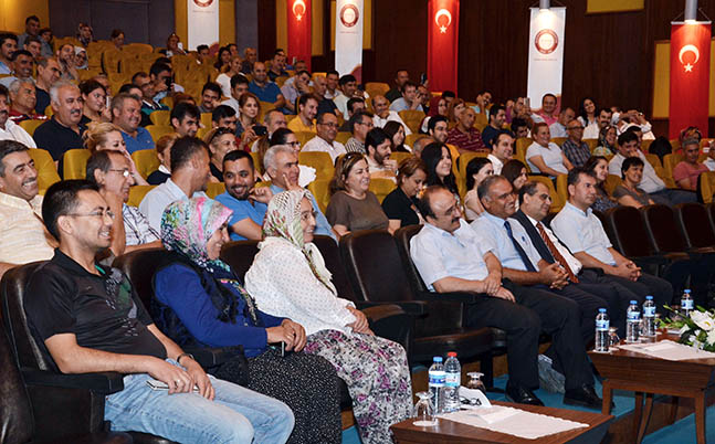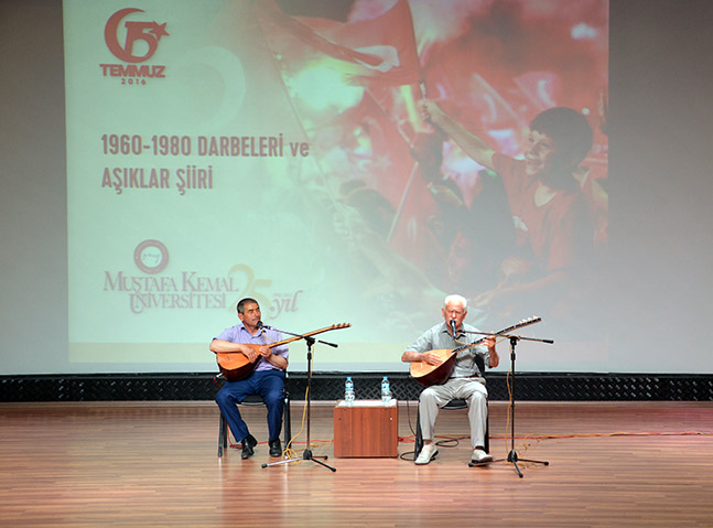 Üniversitemiz Rektörlüğü tarafından Tayfur Sökmen Kampüsü Atatürk konferans salonunda “1960-1980 Darbeleri ve Aşıklar Şiiri” konulu etkinlik düzenlendi. Üniversitemiz Fen Edebiyat Fakültesi Öğretim Üyesi Doç. Dr. Bülent Arı’nın konuşması ve Aşık Feymani ve Aşık Eyyübinin fasılları, darbe konusunun Anadolu halk ozanı olan Aşıkların şiirlerinde hangi şekilde yer aldığı eşsiz örneklerle dinleyicilere anlatıldı. Tayfur Sökmen Kampüsü Atatürk konferans salonunda gerçekleşen etkinlikte konuşan Doç. Dr. Bülent Arı:’’ Demokrasinin kurumsallaşması, çok partili hayata geçişte sancıların yaşanması ve 1960 darbesiyle sonuçlanan bu süreçte aşıkların siyasi gelişmelere bağlı olarak bazen İnönü’yü bazen Demokrat Partiyi ve Menderes’i hedef alan taşlamalar söylediklerine şahit olunmuştur. Bu dönemde aşıklar ülkenin birliğinden yana olmuşlardır. 1980 anarşi ortamına karşı yine aşıkların ortak tavrını görürüz ülkede yaşanan her türlü gelişmeden etkilenen aşıklar milli konular ve memleket sorunlarıyla ilgili şiirler yazmışlardır. Toplum yapısında yaşanan ahlaki yozlaşma onların şiirlerinde işlenen temalar onları birbirine yaklaştırmıştır. 1980 darbesi sonrası değişen dünyada, toplumsal yaşamdaki gelişmeler aşık şiirlerinde yer bulmuştur. 1980 darbesinde yaşananlar, darbe zihniyeti ve olumsuzlukları aşık şiirlerinde işlenmişler. Aşıklar toplumun sorunlarını sıkıntılılarını dile getirip onların duygu ve düşüncelerine tercüman olurlar bu yüzden 1960 ve 80 darbelerine karşı halkın tepkilerini şiirlerinde yoğun bir şekilde dile getirmişlerdir. Aşıklar şiirlerinde baskının arttığı huzur ve hürriyete yönelik bir ortamın söz konusu olmadığı kişilerin özlük haklarının ve sosyal haklarının ellerinden alındığını ifade ederler.” Dedi. Doç. Dr. Bülent Arının konuşmasının ardından sahneye gelen Aşık Feymani ve Aşık Eyyübi aşıklık geleneğinden oluşan örnekleri dinleyicilere sundular. Anadolu’nun kültürel benliğinin yanı sıra kültürel çeşitliliğini yansıtan şiirlerinden oluşan fasılı dinleyicilerle buluşturan aşıklar dinleyiciler tarafından ilgiyle dinlendiler. Etkinlik plaket takdimi ve hatıra fotoğrafı ile sona erdi.