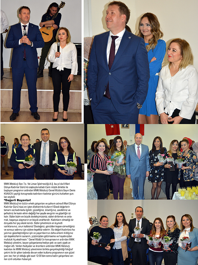 MMK Metalurji San.Tic. Ve Liman İşletmeciliği A.Ş. bu yıl da 8 Mart Dünya Kadınlar Günü’nü coşkuyla kutladı.Canlı müzik dinletisi ile başlayan programın ardından MMK Metalurji Genel Müdürü Sayın Denis KVASOV yaptığı konuşmada kadınların kadınlar gününü kutlarken şunları söyledi:
