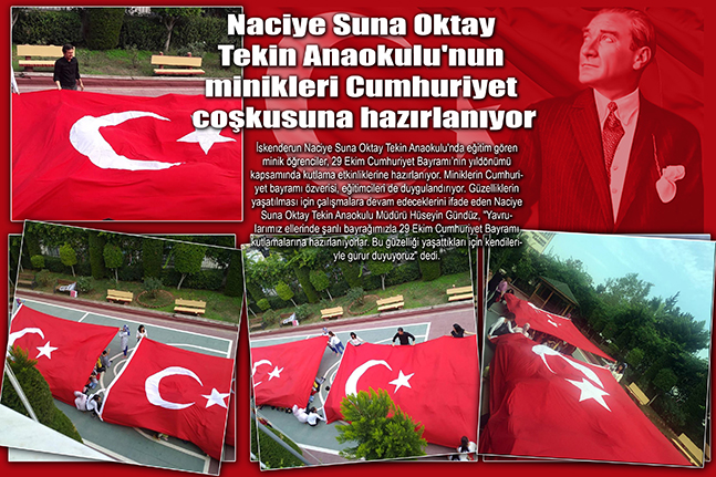 İskenderun Naciye Suna Oktay Tekin Anaokulu’nda eğitim gören minik öğrenciler, 29 Ekim Cumhuriyet Bayramı’nın yıldönümü kapsamında kutlama etkinliklerine hazırlanıyor. Miniklerin Cumhuriyet bayramı özverisi, eğitimcileri de duygulandırıyor. Güzelliklerin yaşatılması için çalışmalara devam edeceklerini ifade eden Naciye Suna Oktay Tekin Anaokulu Müdürü Hüseyin Gündüz, “Yavrularımız ellerinde şanlı bayrağımızla 29 Ekim Cumhuriyet Bayramı kutlamalarına hazırlanıyorlar. Bu güzelliği yaşattıkları için kendileriyle gurur duyuyoruz” dedi.