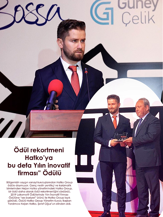 Bölgemizin saygın sanayi kuruluşlarından Hatko Group ödüle doymuyor. Genç neslin yenilikçi ve karizmatik isimlerinden Nejan Hatko yönetimindeki Hatko Group, bir ödül daha alarak ödül rekortmenliğini sürdürdü. 2019 Lokomotif Ödüllerinde Yılın İnovatif Firması Ödülüne “ses bariyeri” ürünü ile Hatko Group layık görüldü. Ödülü Hatko Group Yönetim Kurulu Başkan Yardımcısı Nejan Hatko, Şeref Oğuz’un elinden aldı.