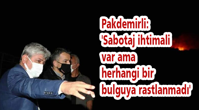 Hatay’daki orman yangınının takip ve koordinesi için Hatay’a gelen Tarım ve Orman Bakanı Bekir Pakdemirli, söndürme çalışmalarını inceledi. Bakan Pakdemirli, sabotaj ihtimali üzerinde durulduğu ama henüz bir bulguya rastlanmadığını söyledi. Hatay’ın İskenderun ilçesinde çıkan orman yangınının takip ve koordinesi için Hatay’a gelen Tarım ve Orman Bakanı Bekir Pakdemirli, helikopterle bölgede incelemede bulunduktan sonra karadan da incelemelerini sürdürdü. İncelemeler sırasında gazetecilere açıklama yapan Bakan Pakdemirli, Mersin’in Anamur ilçesinde, Adana’nın Kozan ilçesinde ve İskenderun’daki yangınların son durumu hakkında bilgiler verdi. Türkiye genelinde bugün 17 yangınla mücadele ettiklerini dile getiren Bakan Pakdemirli, Anamur ve İskenderun’daki yangınlar hariç hepsinin kontrol altına alındığını kaydetti.“En kısa zamanda kontrol altına almaya çalışacağız”