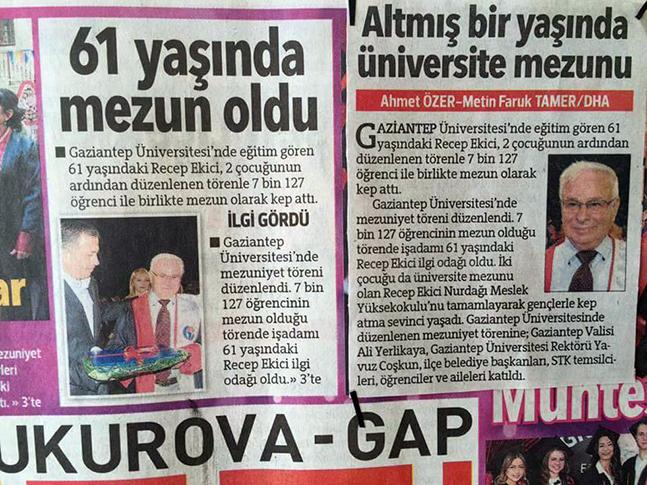 Dereceye giren öğrencilere şeref madalyası verilirken, törenin en dikkat çeken ismi ise Nurdağı Meslek Yüksekokulu Tıbbi ve Aromatik Bitkiler Bölümü’nü dereceyle bitiren 61 yaşındaki 3 çocuk babası Ekinciler Holding Yönetim Kurulu Üyesi Recep Ekinci oldu. Ekinci’ye Gaziantep Valisi Ali Yerlikaya ve Gaziantep Üniversitesi Rektörü Prof. Dr. Yavuz Coşkun tarafından Yüksek Şeref Belgesi verildi. 3 çocuğundan ikisi kendisinden önce mezun olan Ekinci, 1990 yılından bu yana tıbbi aromatik bitkilerle ilgilendiğini söyledi. Tıbbi aromatik bitkilere ilgisinin hobi olarak başladığını anlatan Ekinci, “Ancak daha sonra pratiğimi teorik olarak öğrenmek istedim. Okula başladığımda bu konuda bilgi sahibi olduğumu gördüm ama eksikliğimi de gördüm.