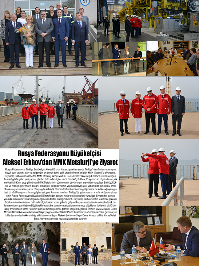 Rusya Federasyonu Türkiye Büyükelçisi Aleksei Erkhov Hatay ziyareti sırasında Türkiye’nin sıfırdan yapılmış en büyük özel yatırımı olan ve bölgemizin en büyük demir çelik üreticilerinden biri olan MMK Metalurji’yi ziyaret etti. Büyükelçi Erkhov’u misafir eden MMK Metalurji Genel Müdürü Denis Kvasov Büyükelçi Erkhov’a üretim süreçleri, finansal göstergeler, yeni yatırım planları hakkında bilgiler verdi. Büyükelçi Erkhov, Rusya’nın en büyük demir çelik üreticisi MMK’nın grup şirketi olan MMK Metalurji’nin büyümesinin büyük önem arz ettiğini vurguladı. Bu büyüklükteki ve modern yatırımların başarılı olmasının, bölgede yatırım yapmak isteyen yeni yatırımcılar için olumlu örnek olmasının yanı sıra Rusya ve Türkiye gibi iki büyük ülkenin dostluk köprülerinin gelişmesine de katkı sağlayacağını belirtti. MMK’nın yatırımlarını geliştirmesi, yeni Rus yatırımcıların Türkiye’de yatırımlarının artırılarak devam etmesinin Rusya Federasyonu Büyükelçiliği tarafından sonuna kadar desteklendiğini vurguladı. Şirketin her zaman yanında olduklarını ve karşılaşılan engellerde destek olacağını belirtti. Büyükelçi Erkhov Üretim tesislerini gezerek, fabrika ve üretilen ürünler hakkında bilgi aldıktan sonra şirkette çalışan Rusya vatandaşları ile sohbet ederek onların sorularını yanıtladı ve Büyükelçilik olarak her zaman vatandaşlarının yanında olduklarını ifade etti. MMK Metalurji ziyaretinden sonra Hatay’ın tarihi ve turistik yerlerini görmek isteyen Büyükelçi Erkhov, MMK Metalurji Genel Müdürü Denis Kvasov ile birlikte Antakya’ ya giderek burdaki St Pierre Kilisesi’ni ve arkeoloji müzesini gezerek yetkililerden eserler hakkında bilgi aldıktan sonra Sayın Aleksei Erkhov ve Sayın Denis Kvasov birlikte Hatay Valisi Erdal Ata’ya makamında nezaket ziyaretinde bulundu.