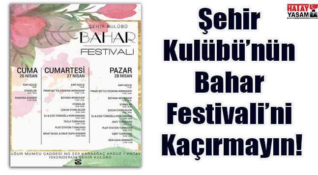 Arsuz Karaağaç 20 Metrelik yol üzerinde faaliyet gösteren İskenderun Şehir Kulübü, 26-28 Nisan tarihleri arasında Bahar Festivali düzenliyor. Düzenledikleri konser, tiyatro ve bir çok etkinliklerden elde ettikleri gelirleri, ihtiyaç sahibi öğrencilere ve okullarının ihtiyaçlarını karşılamak için kullanan İskenderun Şehir Kulübü, bölgenin başarılı ve sosyal sorumluluklarının farkında koca yürekli üyeleriyle bölgede eksikliği fazlasıyla hissedilen Bahar Festivali’ne hazırlanıyor. Pandora, OPS grupları, çocuklar için animasyonlar, açık havada sinema partisi, tavla, okey ve dart turnuvaları gibi bir çok sürprizle Bahar Festivali’ne hazırlanan İskenderun Şehir Kulübü yönetim kurulu, bilet temin etmek isteyenlerin üyelere veya şehir kulübüne başvurmalarını istedi. Muhteşem bir Bahar Festivali hazırlığında son aşamaya geldiklerini belirten İskenderun Şehir Kulübü Başkanı Semir Yıldız, konserler ve diğer tüm etkinliklerle hafızalardan silinmeyecek bir festivali bölge halkıyla buluşturmak isteklerine dikkat çekti.