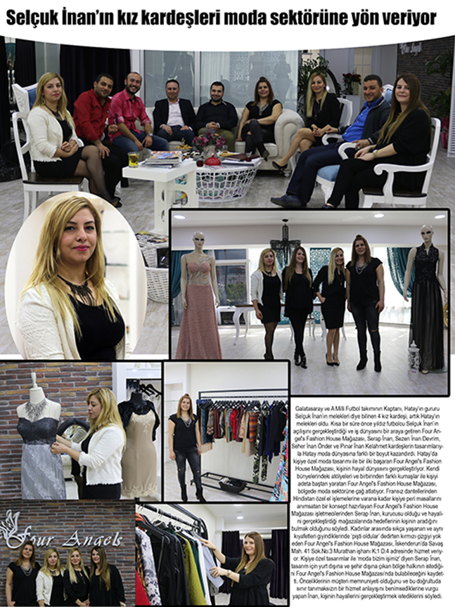Galatasaray ve A Milli Futbol takımının Kaptanı, Hatay’ın gururu Selçuk İnan’ın melekleri diye bilinen 4 kız kardeşi, artık Hatay’ın melekleri oldu. Kısa bir süre önce yıldız futbolcu Selçuk İnan’ın açılışını gerçekleştirdiği ve iş dünyasını bir araya getiren Four Angel’s Fashion House Mağazası, Serap İnan, Sezen İnan Devrim, Seher İnan Önder ve Pınar İnan Kelahmet kardeşlerin tasarımlarıyla Hatay moda dünyasına farklı bir boyut kazandırdı. Hatay’da kişiye özel moda tasarımı ile bir ilki başaran Four Angel’s Fashion House Mağazası, kişinin hayal dünyasını gerçekleştiriyor. Kendi bünyelerindeki atölyeleri ve birbirinden farklı kumaşlar ile kişiyi adeta baştan yaratan Four Angel’s Fashion House Mağazası, bölgede moda sektörüne çağ atlatıyor. Fransız dantellerinden Hindistan özel el işlemelerine varana kadar kişiye peri masallarını anımsatan bir konsept hazırlayan Four Angel’s Fashion House Mağazası işletmecilerinden Serap İnan, kurucusu olduğu ve hayalini gerçekleştirdiği mağazalarında hedeflerinin kişinin aradığını bulmak olduğunu söyledi. Kadınlar arasında sıkça yaşanan ve aynı kıyafetleri giyindiklerinde ‘pişti oldular’ dedirten kırmızı çizgiyi yok eden Four Angel’s Fashion House Mağazası, İskenderun’da Savaş Mah. 41 Sok.No:3 Murathan işhanı K:1 D:4 adresinde hizmet veriyor. Kişiye özel tasarımlar ile ‘moda bizim işimiz’ diyen Serap İnan, tasarım için yurt dışına ve şehir dışına çıkan bölge halkının istediğini Four Angel’s Fashion House Mağazası’nda bulabileceğini kaydetti. Önceliklerinin müşteri memnuniyeti olduğunu ve bu doğrultuda sınır tanımaksızın bir hizmet anlayışını benimsediklerine vurgu yapan İnan, kişinin hayallerini gerçekleştirmek istediklerini söyledi.