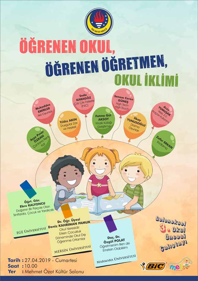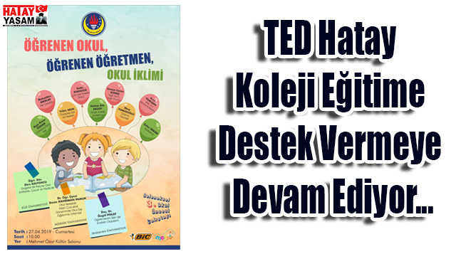 27 Nisan 2019 tarihin de TED Hatay Kolejinde “Öğrenen Okul, Öğrenen Öğretmen, Okul İklimi” başlığıyla 3. Geleneksel Okul Öncesi Öğretmenleri çalıştayı gerçekleşecektir. Marmara Üniversitesinden Doç. Dr. Özgül Polat’ın “Öğretmenim Ben de Einstan Olabilirim”, Mersin Üniversitesinden Dr. Öğretim üyesi Deniz Kahriman Pamuk’un “Okul Neresidir: Erken Çocukluk Döneminde Okul Dışı Öğrenme Ortamları”, Ege Üniversitesinden Öğr. Gör. Ebru Kalyoncu’nun “Doğanın Bir Parçası Olan Sınıflarda, Çocuk ve Yaratıcılık” konu başlıklı sunumlarının ardından; alanında uzman öğretmenler tarafından çalıştaylar düzenlenecektir. Kamu yararına bir dernek olan TED’in bir kolu olan TED Hatay Koleji toplum hizmeti kapsamında düzenlediği Hatay geneli eğitimcilerin katılacağı etkinliler düzenlemeye devam edecektir. Bic firması renkli öğretmen atölyeleri ve çalıştaya vermiş olduğu sponsor desteği ile eğitim sektörüne ciddi katkılar sunmaktadır. Bölgede hizmet vermekte olan Melis Kırtasiye de çalıştaya sponsor desteği vererek eğitim sektöründeki faaliyetlerini sürdürmektedir.