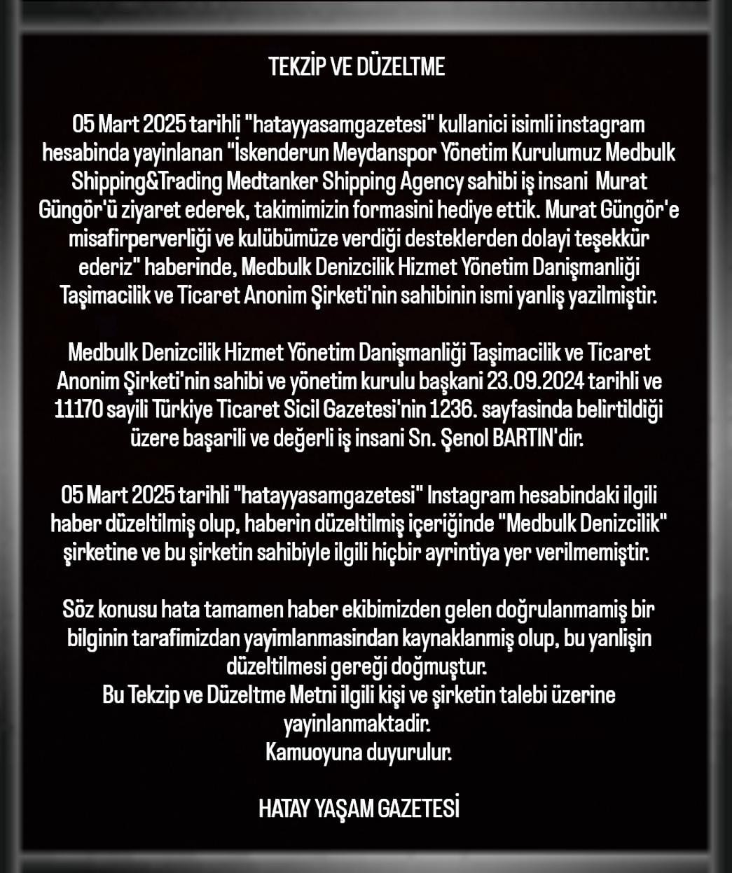 05 Mart 2025 tarihli “hatayyasamgazetesi” kullanıcı isimli instagram hesabında yayınlanan “İskenderun Meydanspor Yönetim Kurulumuz Medbulk Shipping&Trading Medtanker Shipping Agency sahibi iş insanı Murat Güngör’ü ziyaret ederek, takımımızın formasını hediye ettik. Murat Güngör’e misafirperverliği ve kulübümüze verdiği desteklerden dolayı teşekkür ederiz” haberinde, Medbulk Denizcilik Hizmet Yönetim Danışmanlığı Taşımacılık ve Ticaret Anonim Şirketi’nin sahibinin ismi yanlış yazılmıştır.
