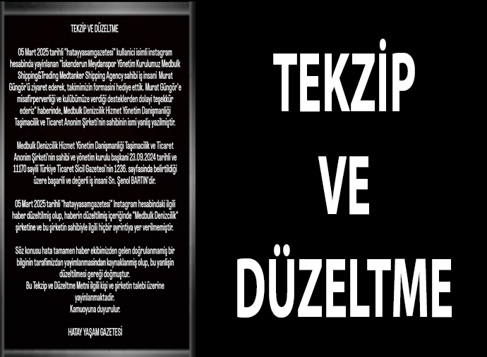 05 Mart 2025 tarihli “hatayyasamgazetesi” Instagram hesabındaki ilgili haber düzeltilmiş olup, haberin düzeltilmiş içeriğinde “Medbulk Denizcilik” şirketine ve bu şirketin sahibiyle ilgili hiçbir ayrıntıya yer verilmemiştir.