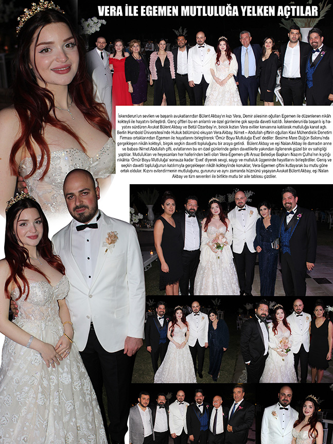 İskenderun’un sevilen ve başarılı avukatlarından Bülent Akbay’ın kızı Vera, Demir ailesinin oğulları Egemen ile düzenlenen nikâh kokteyli ile hayatını birleştirdi. Genç çiftleri bu en anlamlı ve özel günlerine çok sayıda davetli katıldı. İskenderun’da başarılı iş hayatını sürdüren Avukat Bülent Akbay ve Betül Ozanbay’ın, biricik kızları Vera evliler kervanına katılarak mutluluğa kanat açtı. Berlin Humbold Üniversitesi’nde Hukuk bölümünü okuyan Vera Akbay, Nimet – Abdullah çiftinin oğulları Kavi Mühendislik Denetim Firması ortaklarından Egemen ile hayatlarını birleştirerek ‘Ömür Boyu Mutluluğa Evet’ dediler. Besime Mare Düğün Salonu’nda gerçekleşen nikâh kokteyli, birçok seçkin davetli topluluğunu bir araya getirdi. Bülent Akbay ve eşi Nalan Akbay ile damadın anne ve babası Nimet Abdullah çifti, evlatlarının bu en özel günlerinde gelen davetlilerle yakından ilgilenerek güzel bir ev sahipliği yaptılar. Mutlulukları ve heyecanları her hallerinden belli olan Vera-Egemen çifti Arsuz Belediye Başkanı Nazım Çulha’nın kıydığı nikâhta ‘Ömür Boyu Mutluluğa’ sonsuza kadar ‘Evet’ diyerek sevgi, saygı ve mutluluk üçgeninde hayatlarını birleştirdiler. Geniş ve seçkin davetli topluluğunun katılımıyla gerçekleşen nikâh kokteylinde konuklar, Vera-Egemen çiftini kutlayarak bu mutlu güne ortak oldular. Kızını evlendirmenin mutluluğunu, gururunu ve aynı zamanda hüznünü yaşayan Avukat Bülent Akbay, eşi Nalan Akbay ve tüm sevenleri ile birlikte mutlu bir aile tablosu çizdiler.