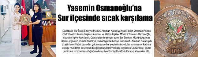 Diyarbakır Sur İlçesi Emniyet Müdürü Asuman Karacı’yı ziyaret eden Ottoman Palace Otel Yönetim Kurulu Başkanı Asistanı ve Halkla İlişkiler Müdürü Yasemin Osmanoğlu, sıcak bir ilgiyle karşılandı. Osmanoğlu ile sohbet eden Sur Emniyet Müdürü Asuman Karacı, ziyaretin anısına Yasemin Osmanoğlu’na hediye takdim etti. Asuman Karacı gibi ülkesini ve milletini canından çok seven ve her şeyin üstünde tutan vatansever kadınlar olduğu müddetçe bu ülkenin bileğinin bükülemeyeceğini kaydeden Osmanoğlu, güzel jestinden ve konukseverliğinden dolayı İlçe Emniyet Müdürü Karacı’ya teşekkür etti.